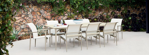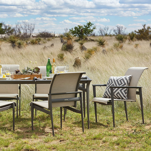 The Flight Dining Armchair offers the ability to save space by stacking pieces four high. Clean, gorgeous lines create the cast and extruded aluminum frame. Beautiful, graceful curves veiled with Versatex mesh in the seat and back.